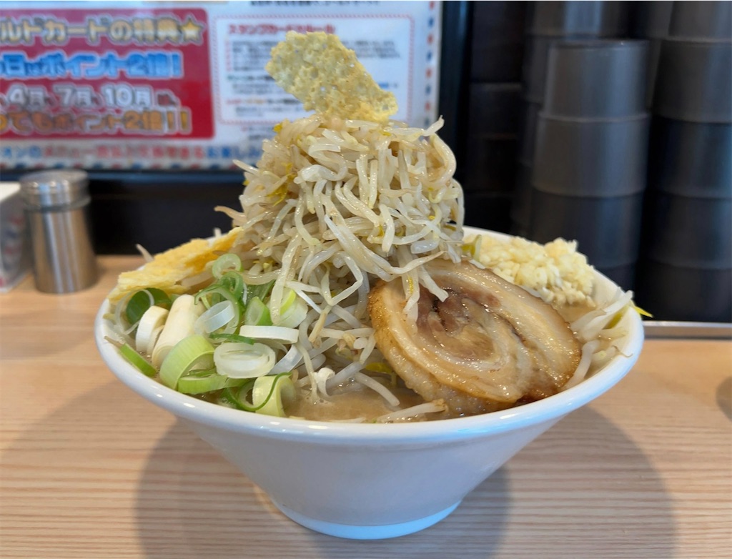 最初のおかわりもやしも入れた天地返しなので もっこり山になっております。 倍盛300gの麺増し100g合わせて400g。